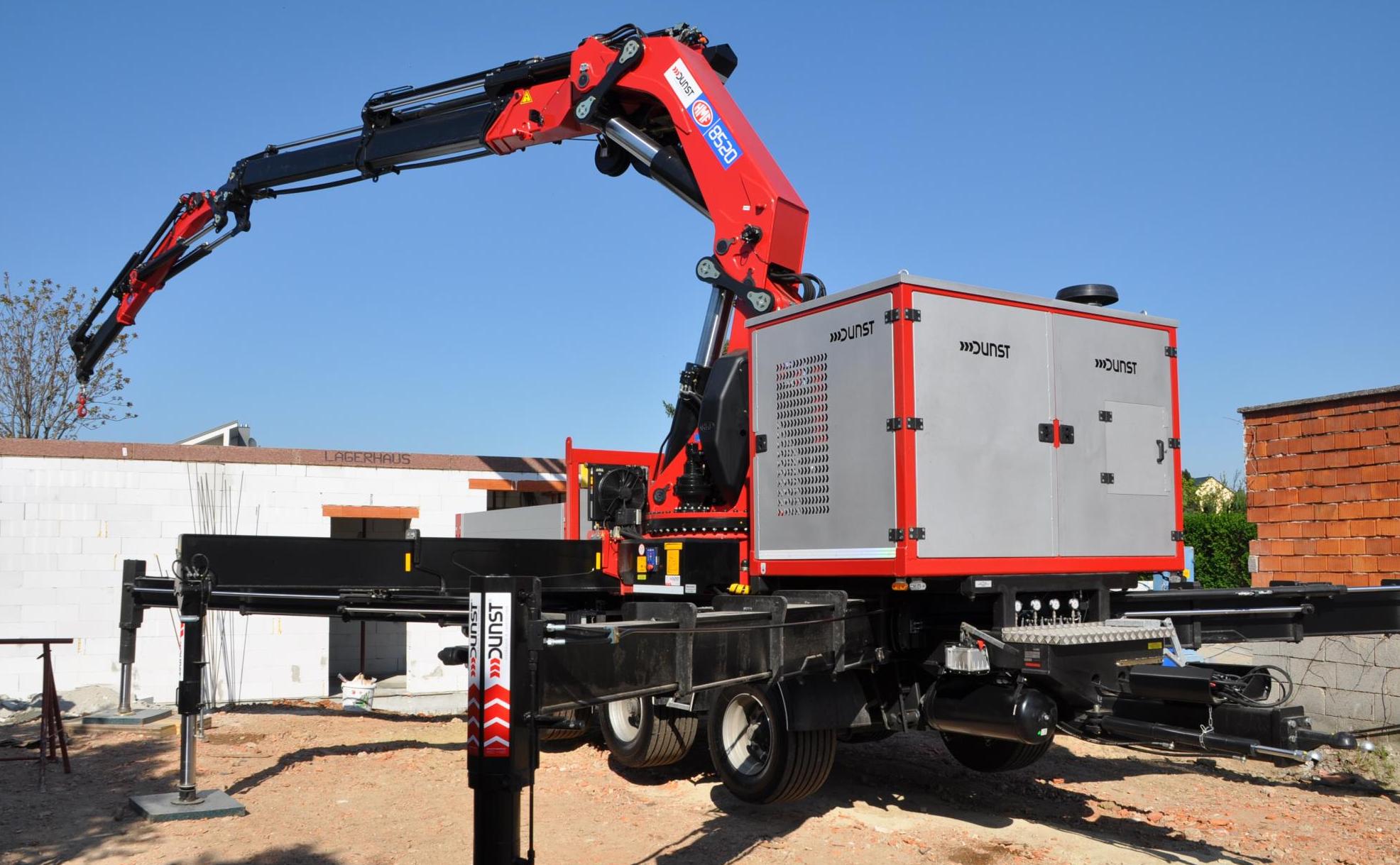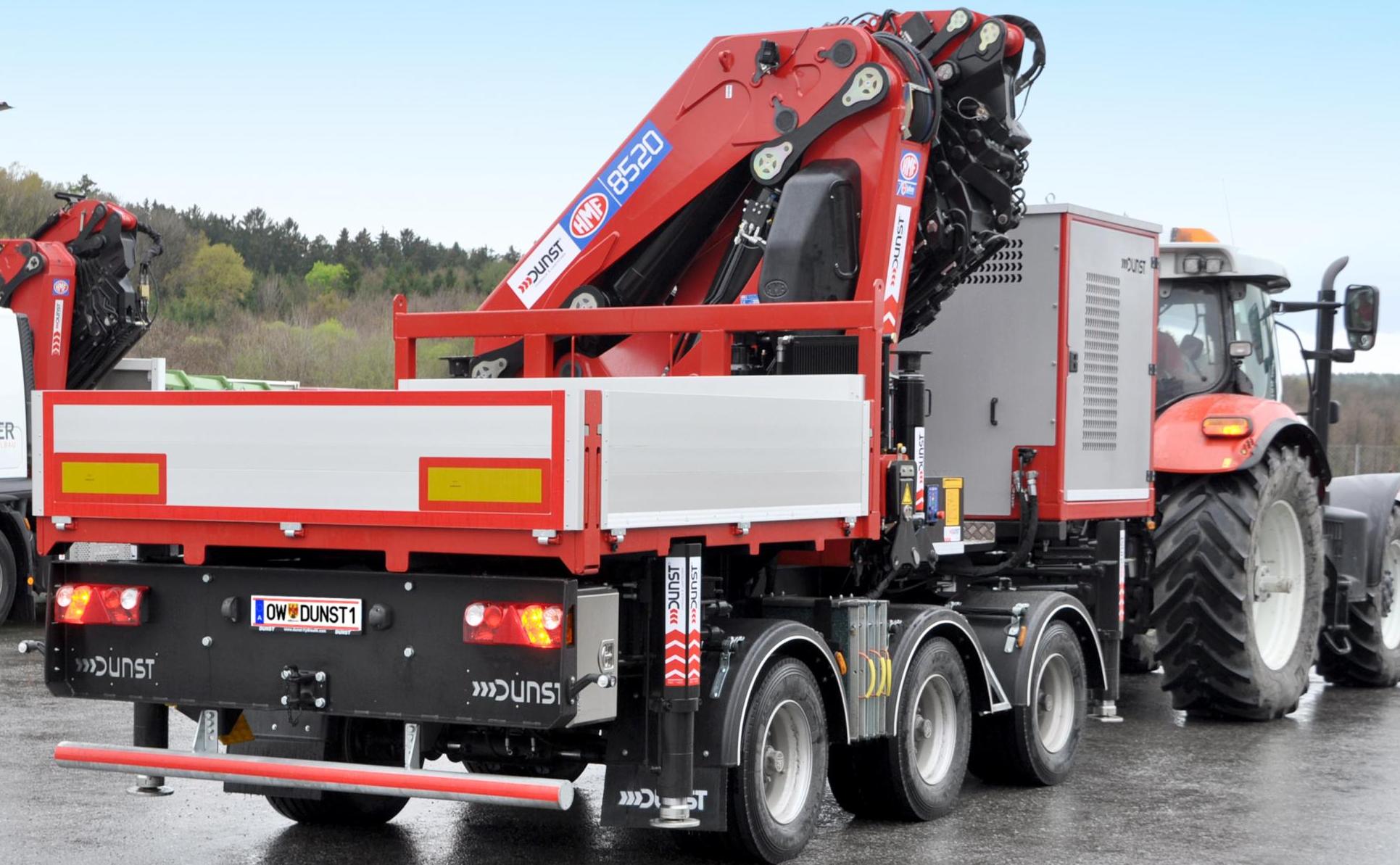 Der von Dunst Hydraulik & Ladetechnik entwickelte Baumeisterkran ist die perfekte Lösung für Baustellen, bei denen es auf Schnelligkeit, Wendigkeit und Mobilität ankommt. Basierend auf dem leistungsstarken HMF 8520-K8 und FJ1200-K4 Ladekran (85 mt) des renommierten dänischen Herstellers HMF, wurde dieser mobile Kran auf einen selbsttragenden, verwindungssteifen Rahmen aufgebaut. Damit bietet dieser LKW Kran maximale Stabilität und Langlebigkeit. Im Vergleich zu klassischen Turmdrehkranen überzeugt der Baustellenkran durch schnellen Aufbau, autonomen Betrieb und die Fähigkeit, mehrere Baustellen an nur einem Tag abzufahren – ohne zusätzliches Zugfahrzeug.