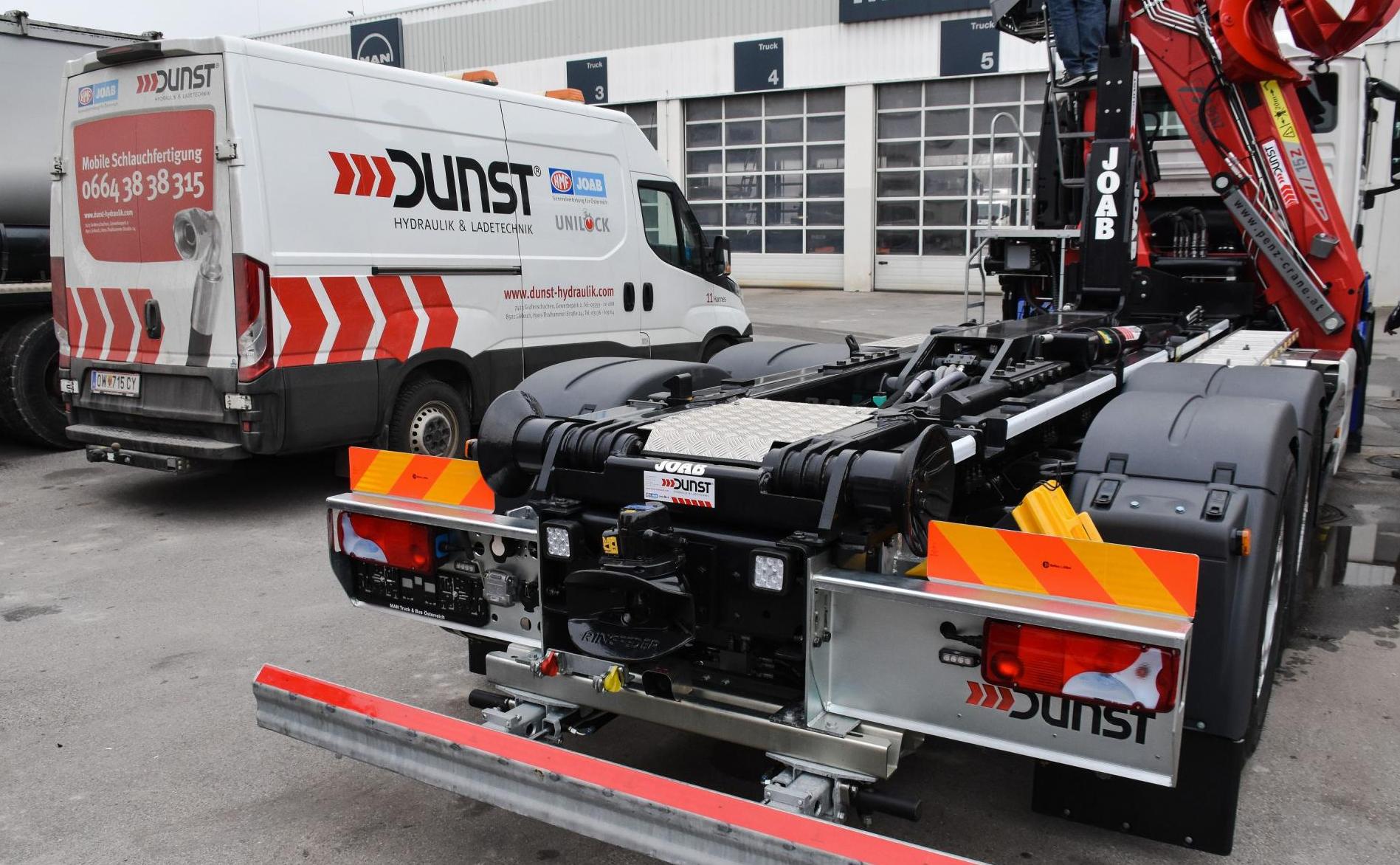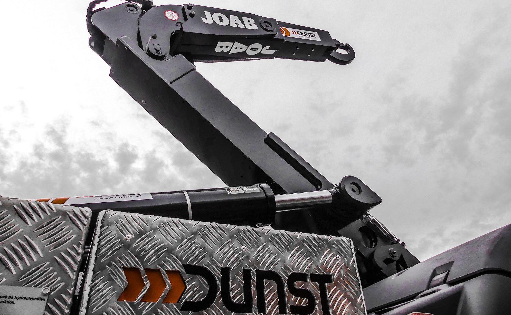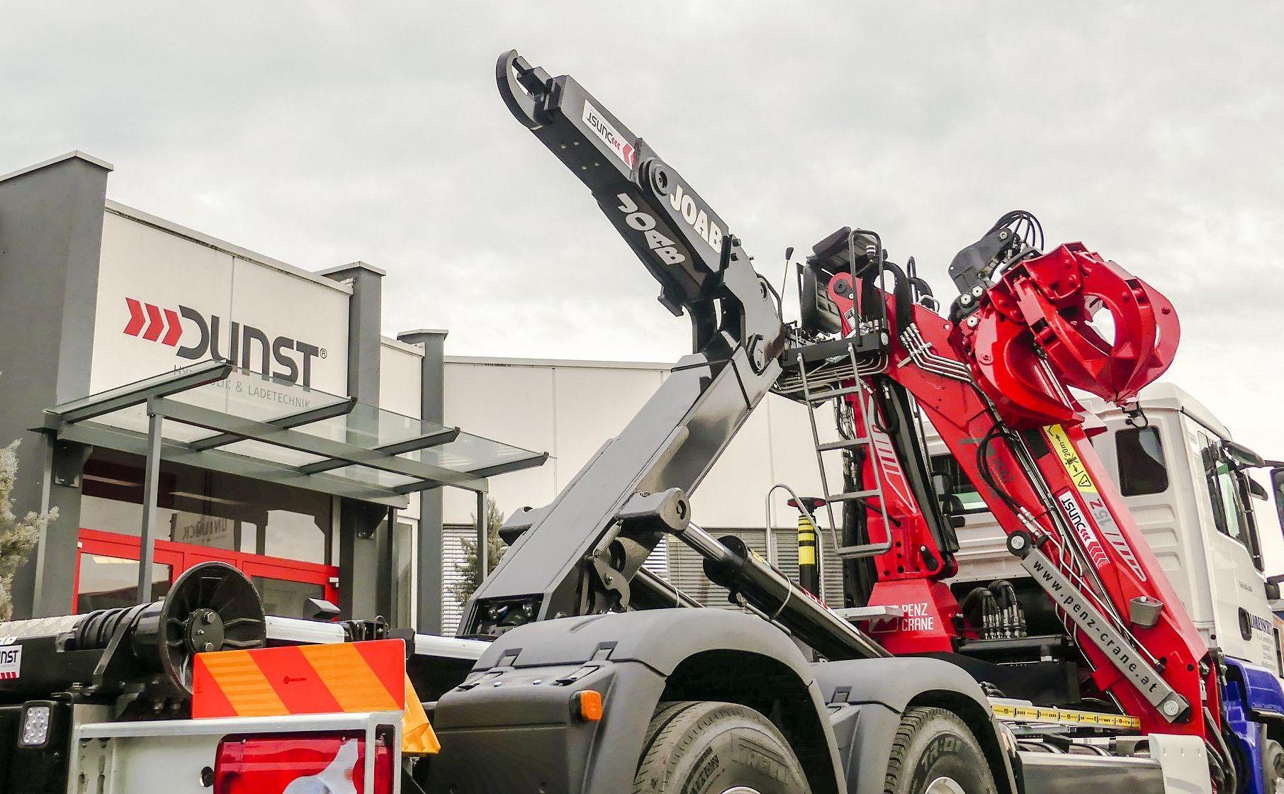 Montage eines JOAB Abrollkippers L20A und eines Penz-Kranes front