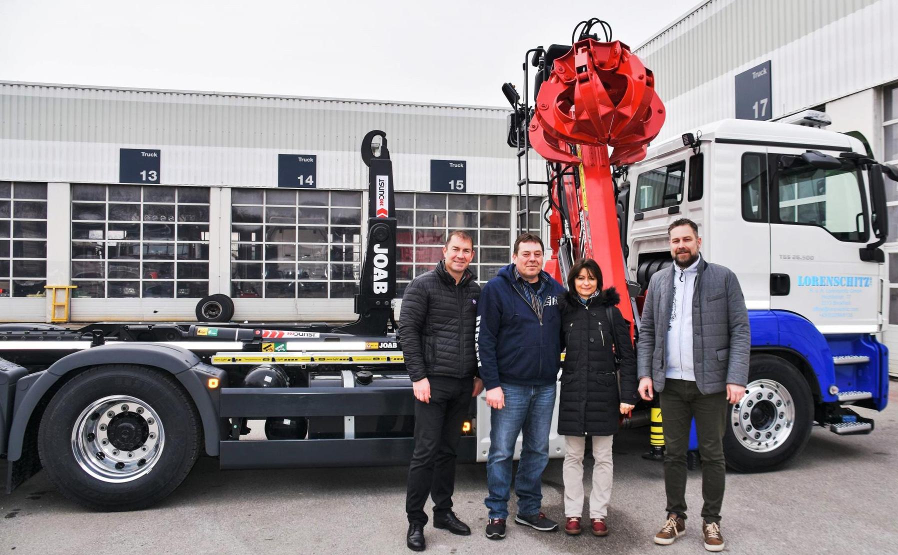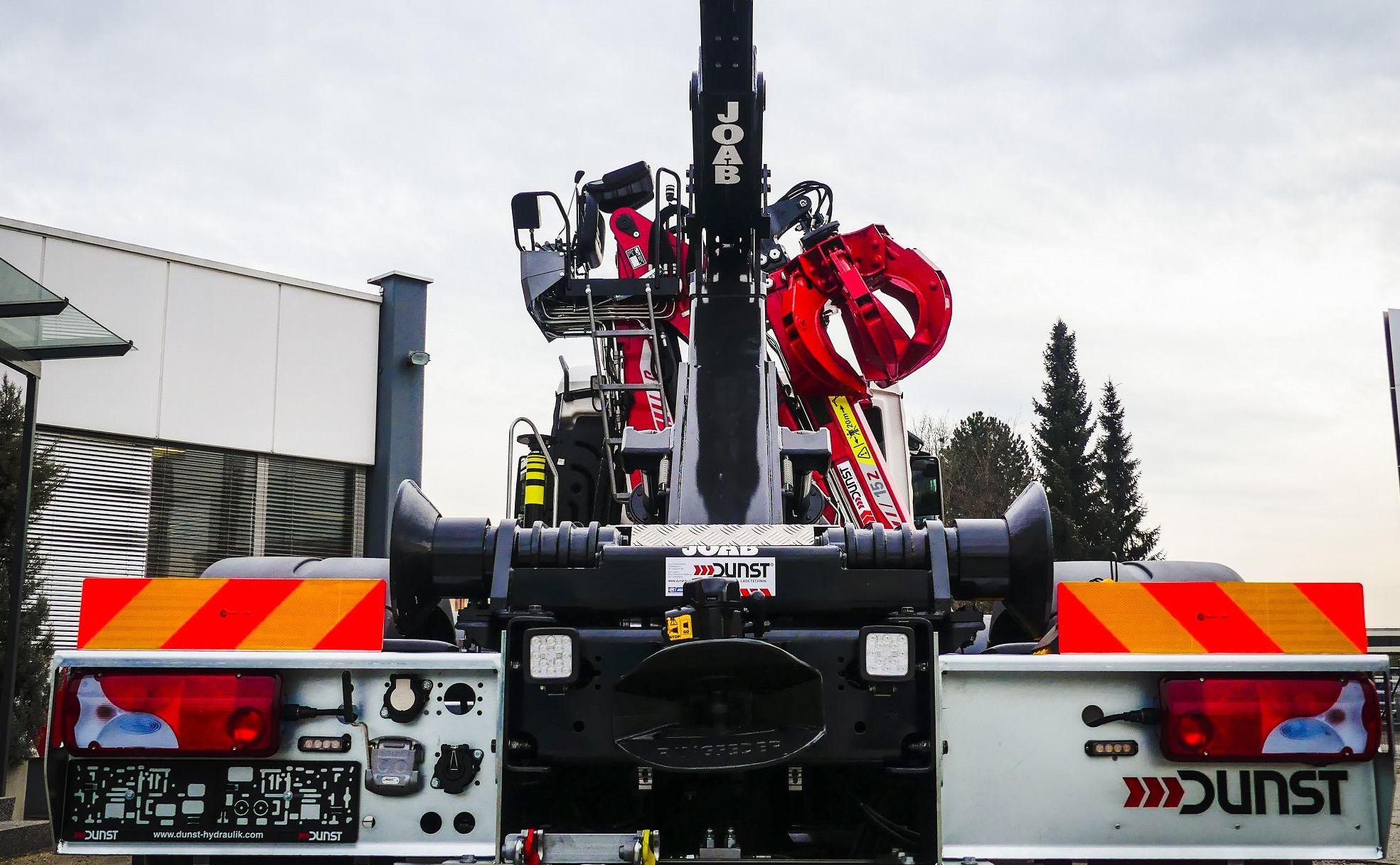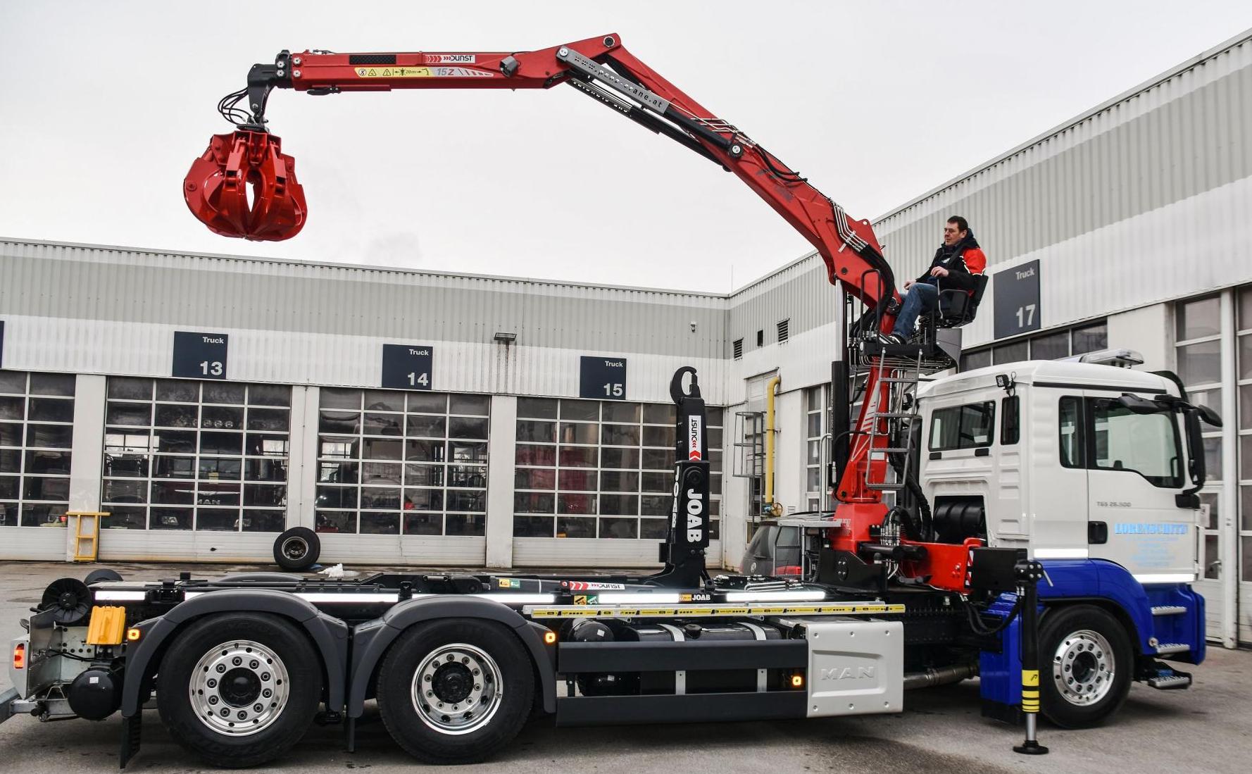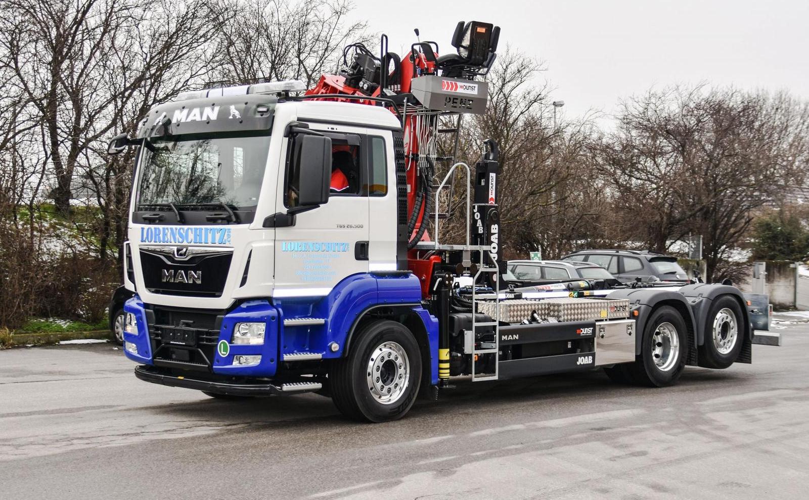 Montage eines JOAB Abrollkippers L20A und eines Penz-Kranes front