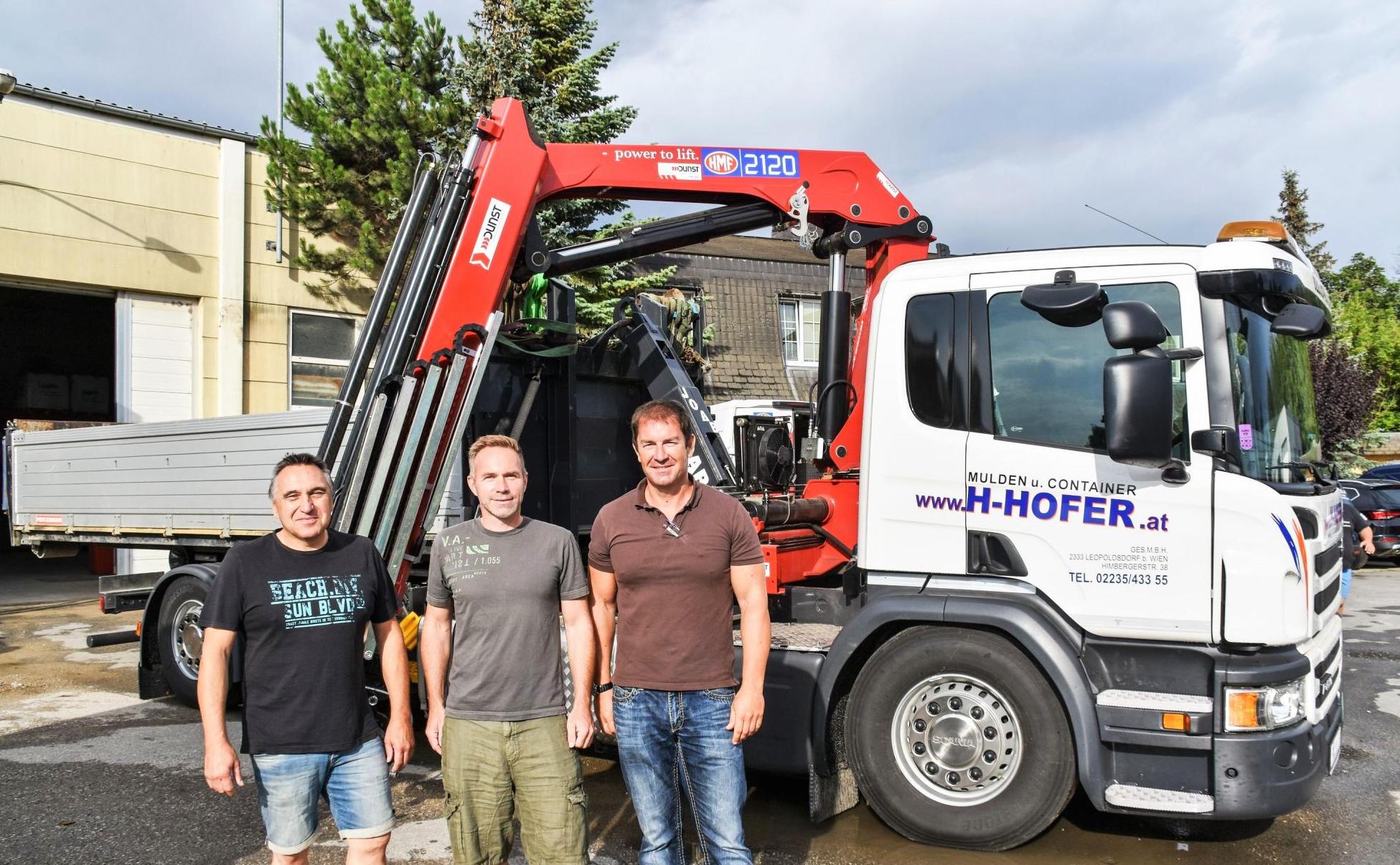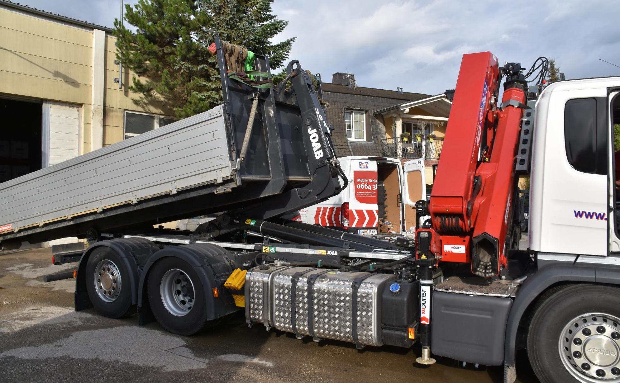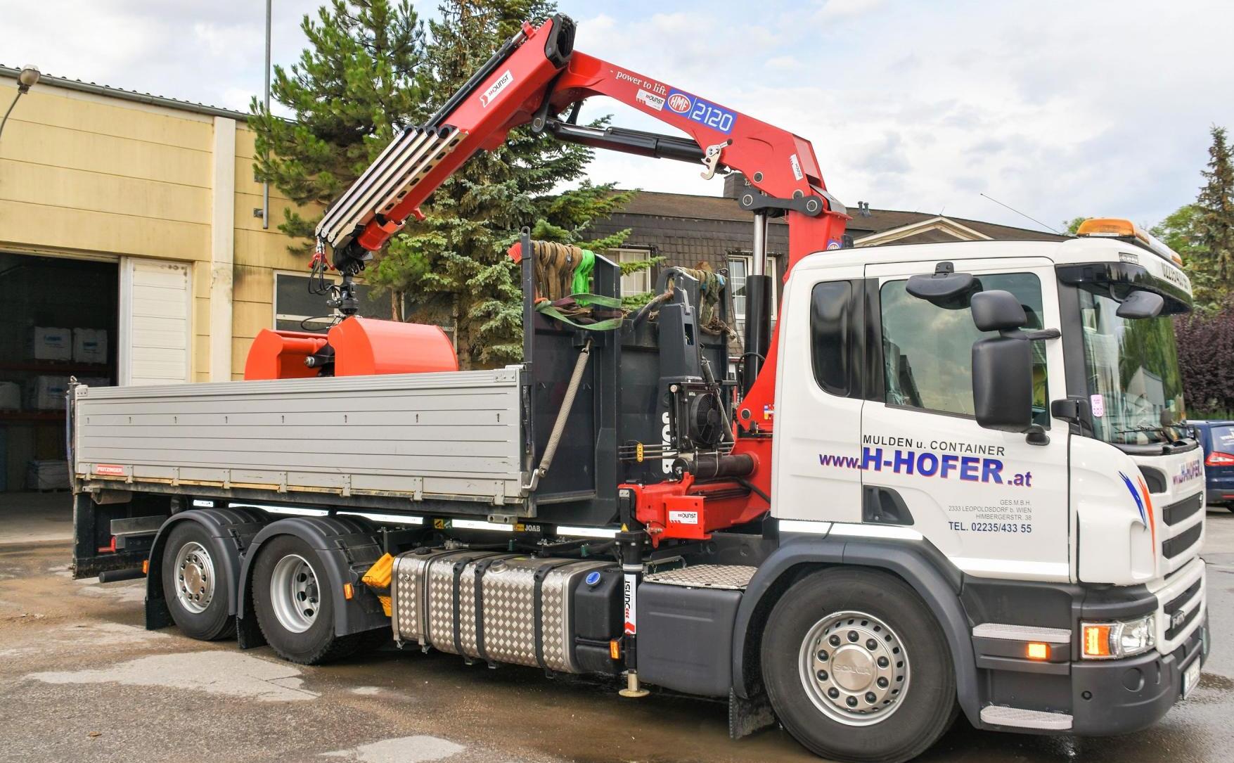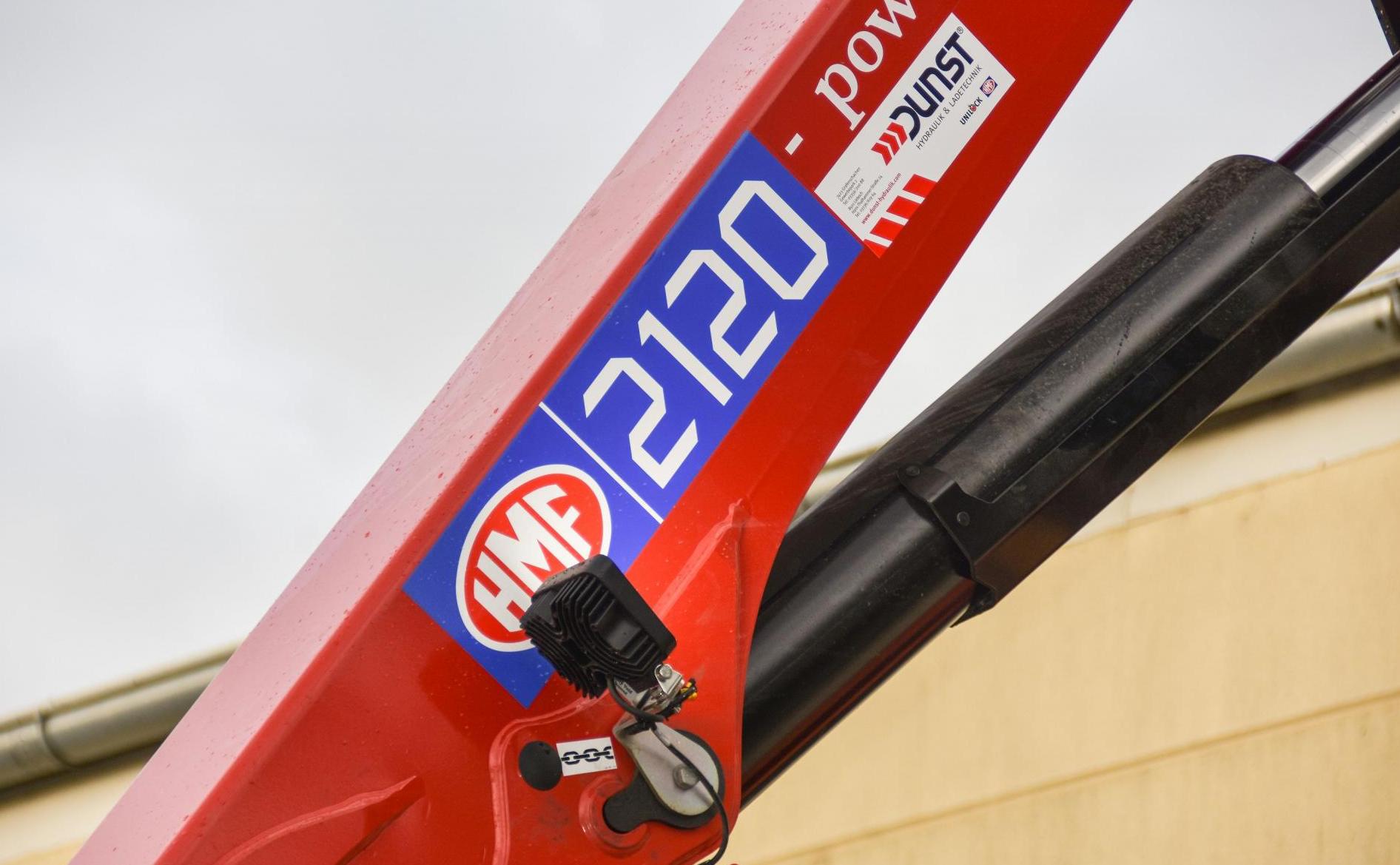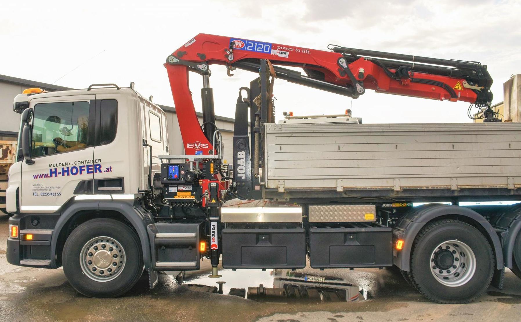 Montage eines JOAB Abrollkippers L20A und eines HMF 2120-K4 Ladekranes front