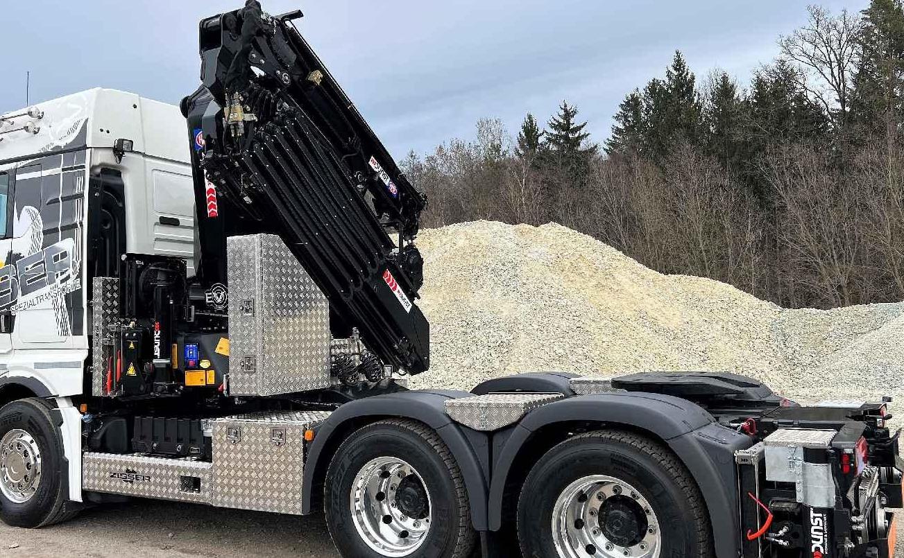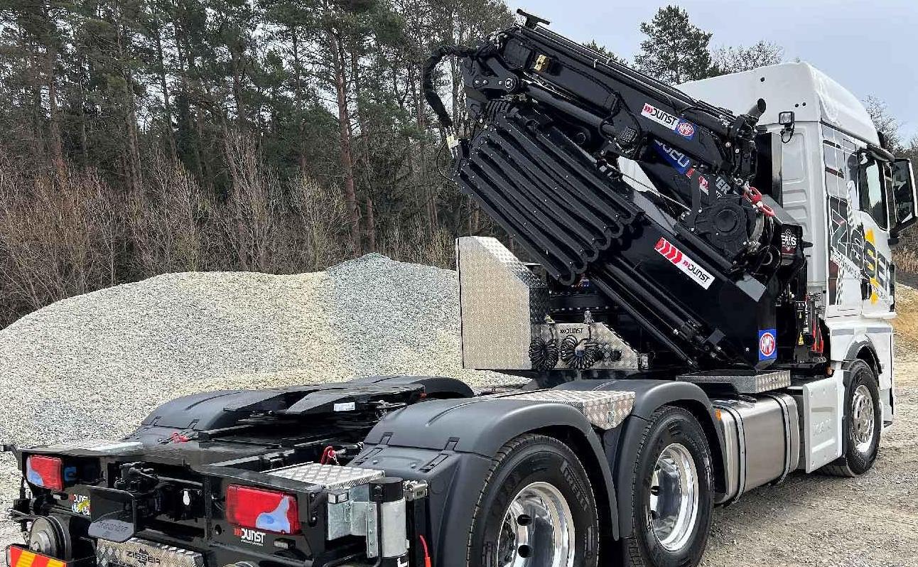 Montage eines HMF 5020-K6 + FJ1000-K4 Ladekranes front auf Sattelzugmaschine