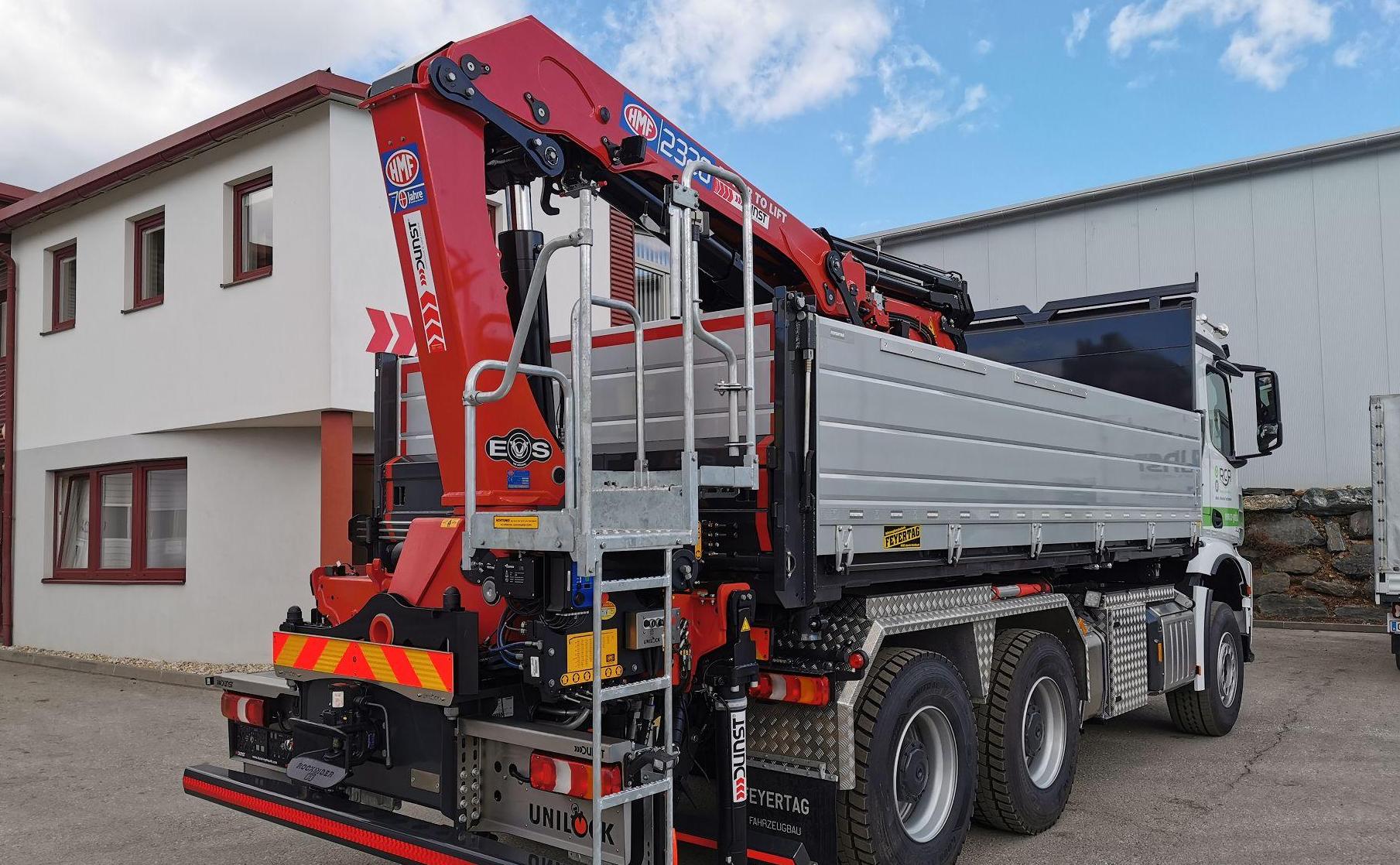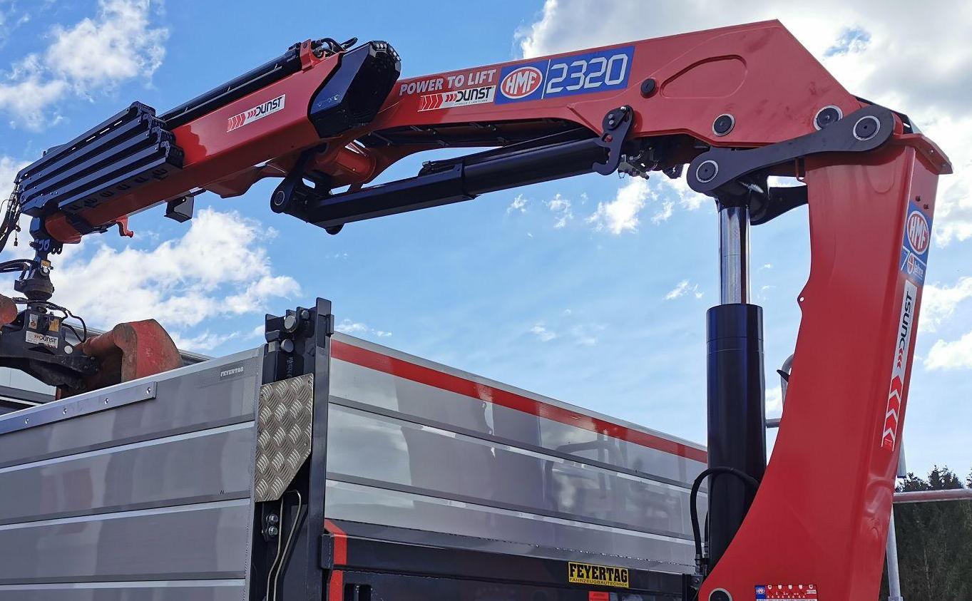 Montage eines HMF 2320-K4 Ladekranes heck abnehmbar auf UNILOCK 250 Kran-Schnellwechselsystem