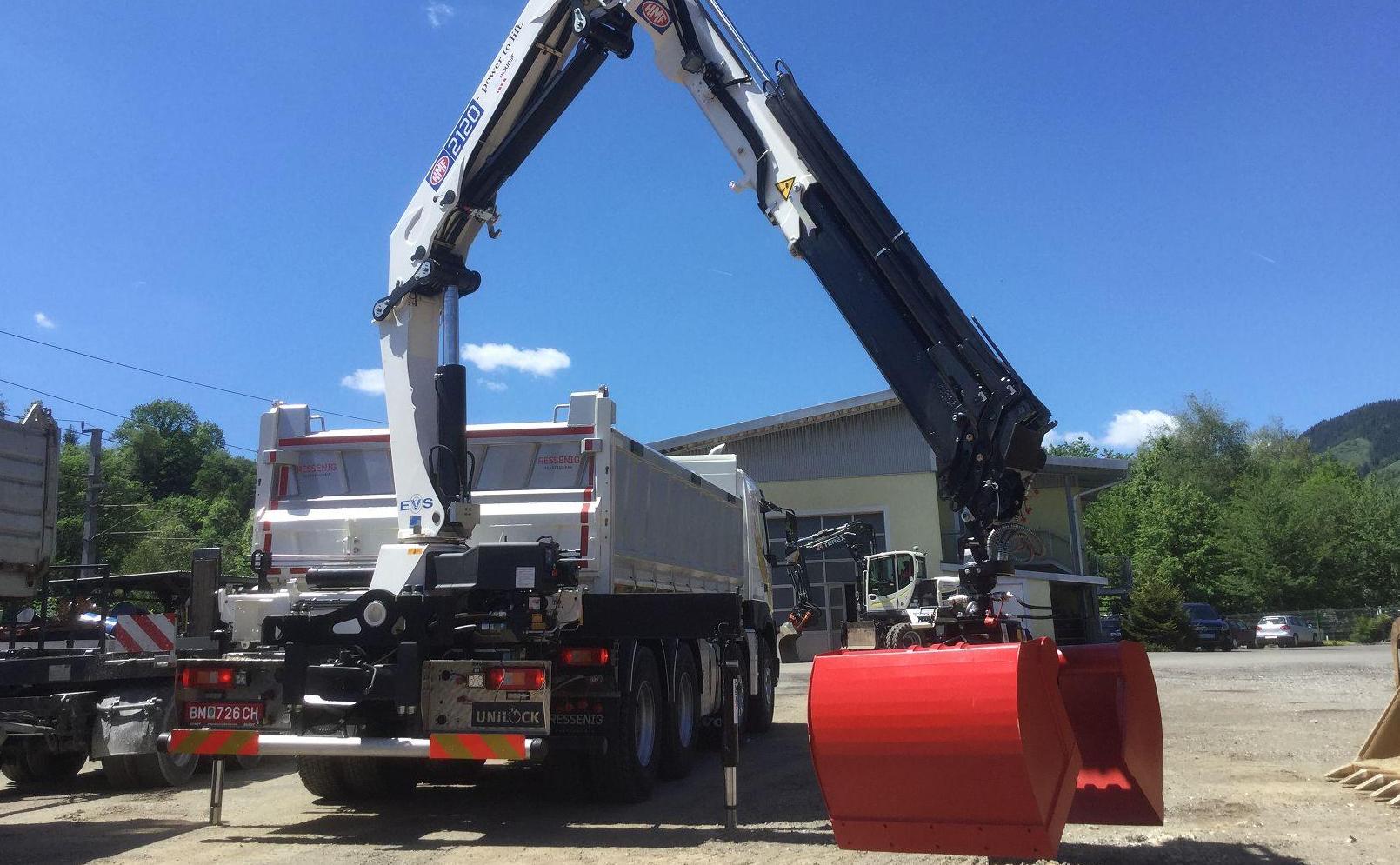 Montage eines HMF 2120-K4 Ladekranes heck abnehmbar auf Unilock-Krankonsole