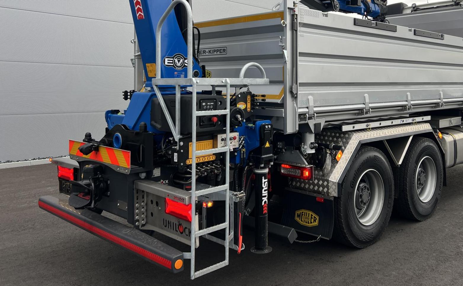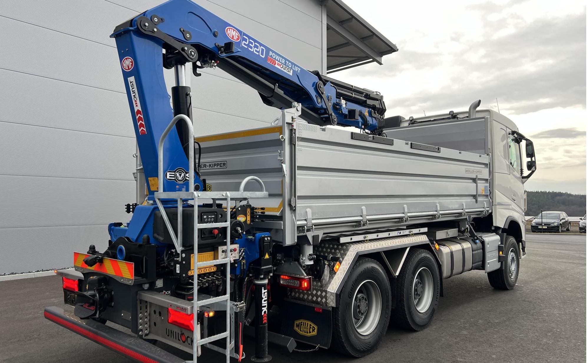 Montage eines HMF 2320-K5 Ladekranes + Unilock 250 Schnell-Wechselsystem + Kranmontage Heck abnehmbar